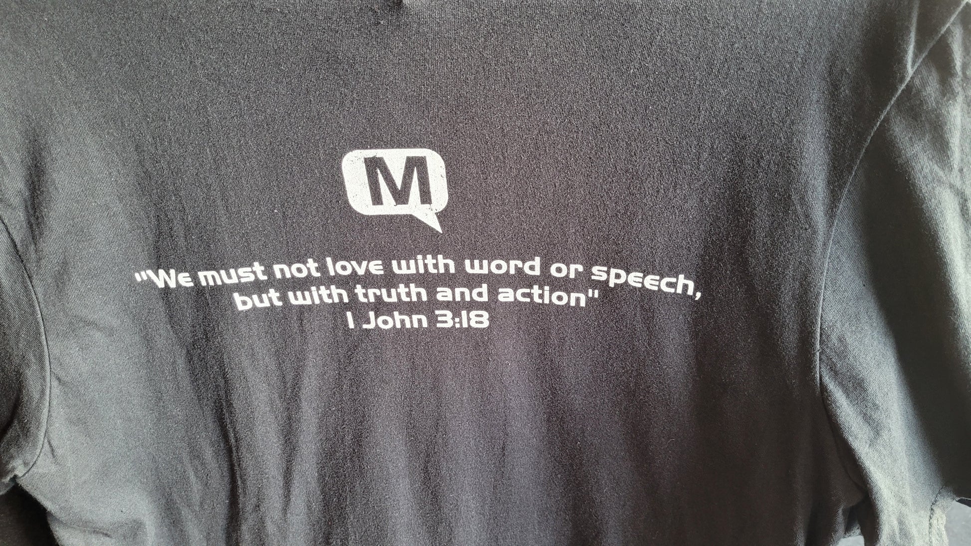 Back of T-Shirt: "We must not love with words or speech, but with truth and action" I John 3:18